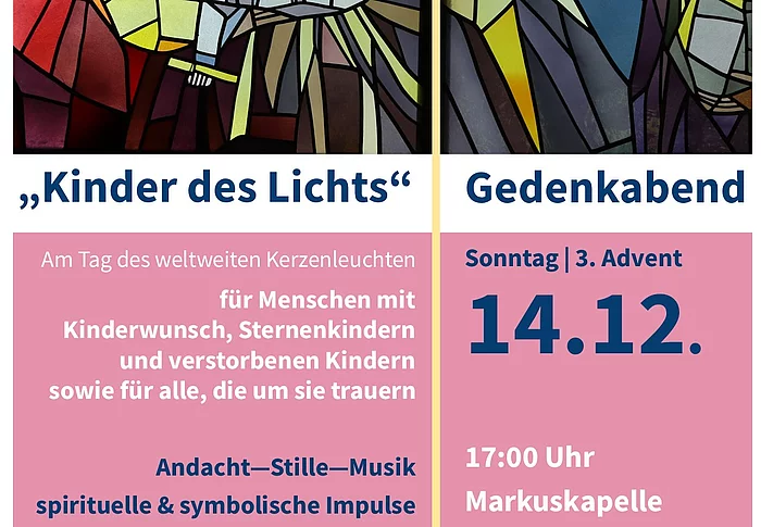 Unter dem Titel „Kinder des Lichts“ bieten wir am Sonntag, 14. Dezember, um 17 Uhr erstmals einen besonderen Gedenkabend am Tag des Weltweiten Kerzenleuchten an für Menschen mit Kinderwunsch, Sternenkindern, verstorbenen Kinder und für alle, die um sie trauern.