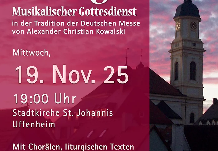 An Buß- und Bettag, 19.11.2025, findet ein der musikalischer Gottesdienst um 19:00 Uhr in der Stadtkirche Uffenheim statt. Der Abendgesang von Alexander Christian Kowalski wird gestaltet von der Kantorei mit Chorälen, liturgischen Texten und berührender Musik für die Abendstunde - ein Zusammenspiel von Kantorei, Klavier (Christian Glowatzki) und Gemeindegesang. Leitung: Uli Beigel