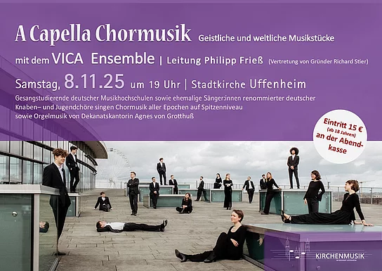 Am Samstag, 8.11.2025 gastiert das VIVA Ensemble in der Stadtkirche in Uffenheim. Sie präsentieren geistliche und weltliche Musikstücke unter der Leitung von Phillip Frieß, der den Gründer Richard Stier vertritt. Das Ensemble setzt sich zusammen aus Gesangstudierenden deutscher Musikhochschulen sowie ehemaligen Sängerinnen und Sängern deutscher Knaben- und Jugendchöre. Den Besucher erwartet Chormusik aller Epochen auf Spitzenniveau sowie Orgelmusik der Dekanatskantorin Agnes von Grotthuß. Karten gibt es an der Abendkasse für 15 Euro für Besucher ab 18 Jahren.