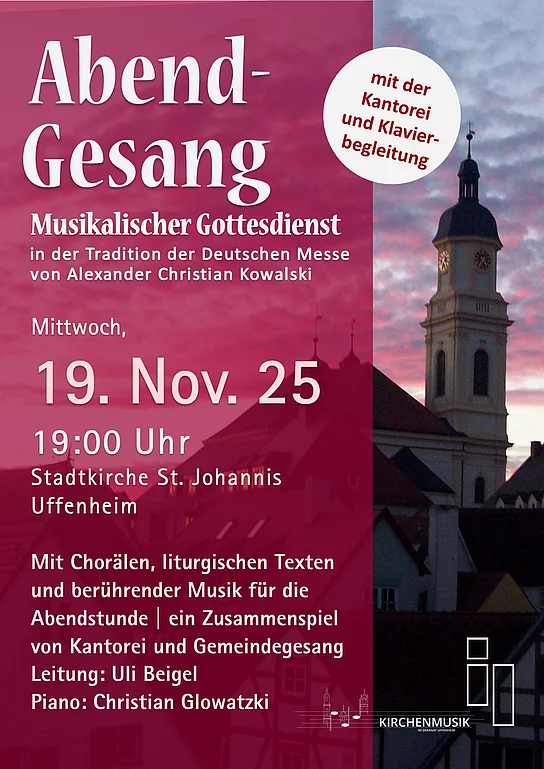 An Buß- und Bettag, 19.11.2025, findet ein der musikalischer Gottesdienst um 19:00 Uhr in der Stadtkirche Uffenheim statt. Der Abendgesang von Alexander Christian Kowalski wird gestaltet von der Kantorei mit Chorälen, liturgischen Texten und berührender Musik für die Abendstunde - ein Zusammenspiel von Kantorei, Klavier (Christian Glowatzki) und Gemeindegesang. Leitung: Uli Beigel