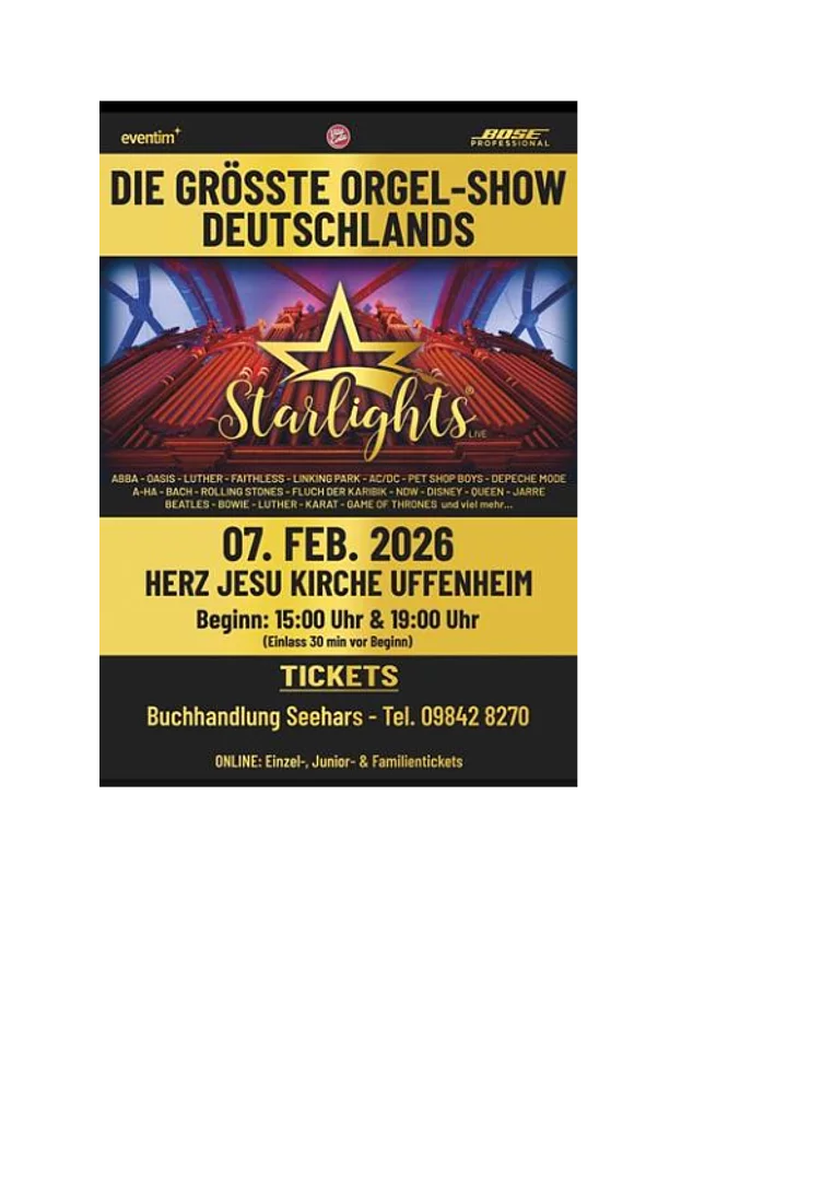 Beginn: 15 Uhr & 19 Uhr (Einlass 30 min vor Beginn) Tickets: Buchhandlung Seehars - Tel. 09842 8270 Online: Einzel-, Junior- & Familientickets
