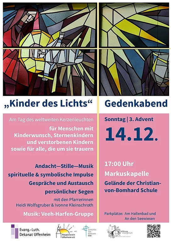 Dieser findet in der St. Markus-Kapelle auf dem Gelände der Christian-von-Bomhard Schule Uffenheim statt und beginnt mit einer Andacht, Stille und Musik. Verschiedene Stationen mit spirituellen und symbolischen Impulsen und Texten laden dann zur Entdeckung und eigenen Vertiefung ein. Anschließend gibt es die Möglichkeit ins Gespräch und in den Austausch zu kommen, sowie die Möglichkeit sich persönlich segnen zu lassen. Der Abend wird von Ivonne Kleinschroth, Schulpfarrerin, und Heidi Wolfsgruber, Pfarrerin in der Erwachsenenbildung gestaltet und von der Veeh-Harfen-Gruppe des Hospizvereins musikalisch umrahmt. Parkplatzmöglichkeit gibt es am Hallenbad oder An den Seewiesen
