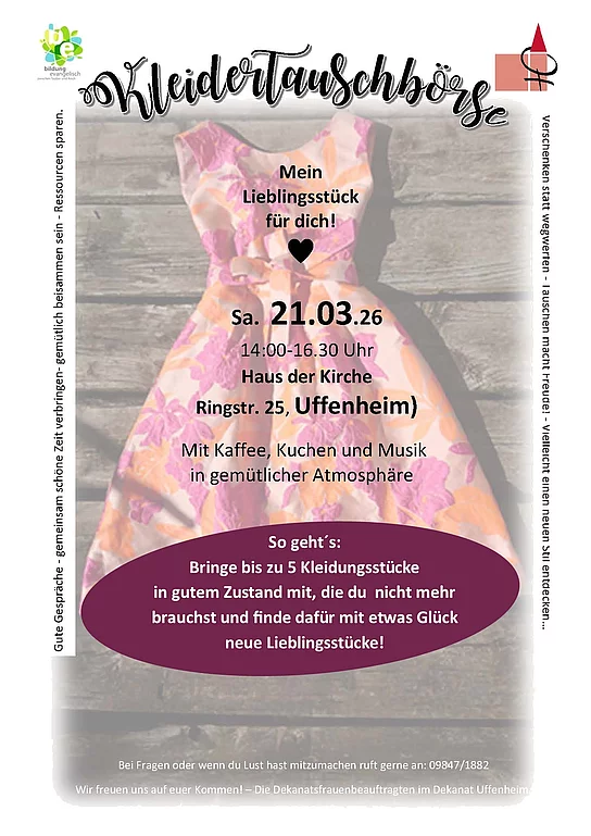 Für einen Samstag Nachmittag verwandelt sich das Haus der Kirche in einen Modetreff. Das Team der Dekanatsfrauen lädt zum Kleidertausch ein. Bis zu 5 Kleidungsstücke in gutem Zustand können zum Tausch mitgebracht werden. Diese werden auf Kleiderständern liebevoll arrangiert und können in Umkleidekabinen anprobiert werden. Bereits zum vierten Mal laden die Dekanatsfrauen in gemütlicher Atmosphäre dazu ein, nicht mehr benötigte Kleidung mitzubringen und freuen sich, wenn neue Lieblingsstücke gefunden und mitgenommen werden. Dazu gibt es Kaffee, Kuchen und Musik. Wer Fragen hat oder gerne im Team mitarbeiten möchte, darf sich gerne unter 09847 1882 informieren.