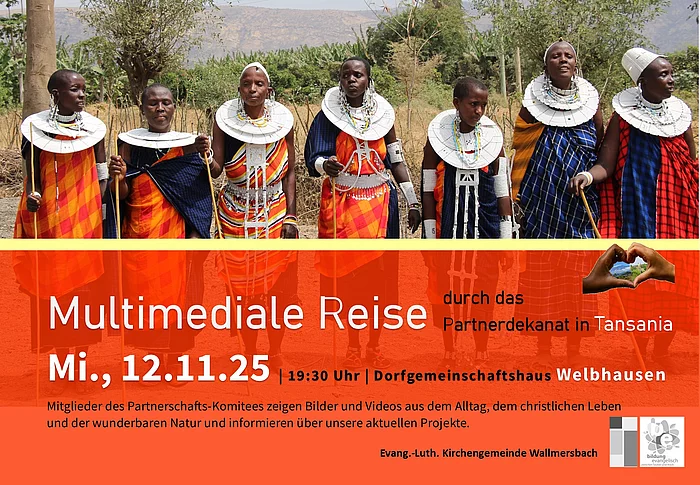 Mitglieder der Partnerschaftskomitees zeigen Bilder und Videos aus dem Partnerdekanat in Tansania am Mittwoch, 12.11.2025 um 19.30 Uhr im Dorfgemeinschaftshaus Welbhausen. Lassen Sie sich mitnehmen auf die multimediale Reise in den Alltag, das christliche Leben und die wunderbare Natur und erfahren sie mehr über die aktuellen Projekte, die vom Dekanat gefördert werden.
