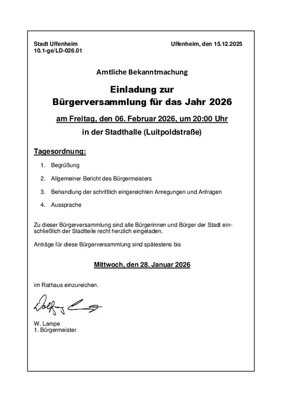 Einladung zur Bürgerversammlung für das Jahr 2026 am Freitag, den 06. Februar 2026, um 20:00 Uhr in der Stadthalle (Luitpoldstraße).