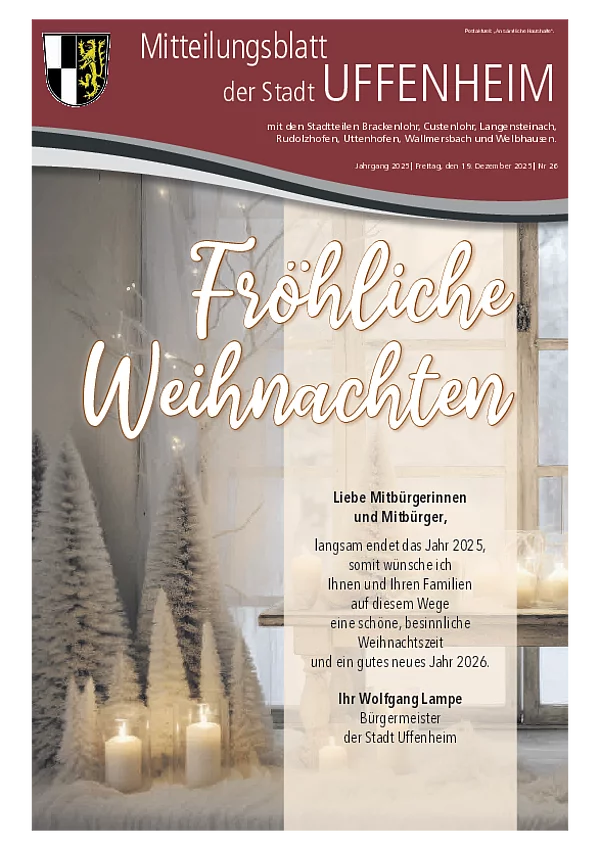 Das nächste Mitteilungsblatt im Jahr 2026 erscheint in der 5. KW. Redaktionsschluss ist Dienstag, 20.01.2026 um 10:00 Uhr!