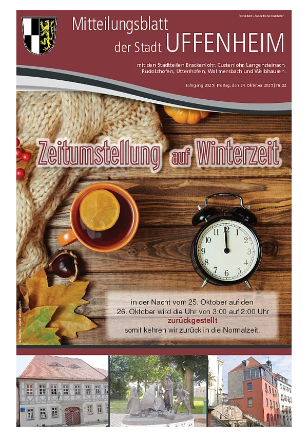 das Mitteilungsblatt der Stadt Uffenheim erscheint 14-tägig, bis spätestens Freitag, in den ungeraden Wochen und wird kostenlos an alle Haushalte verteilt. Redaktionsschluss ist jeweils dienstags in den geraden Kalenderwochen um 10:00 Uhr. Fällt in die Erscheinungswoche ein gesetzlicher Feiertag oder der Redaktionsschluss auf einen Feiertag, so wird der Redaktionsschluss um mindestens einen Werktag vorverlegt.